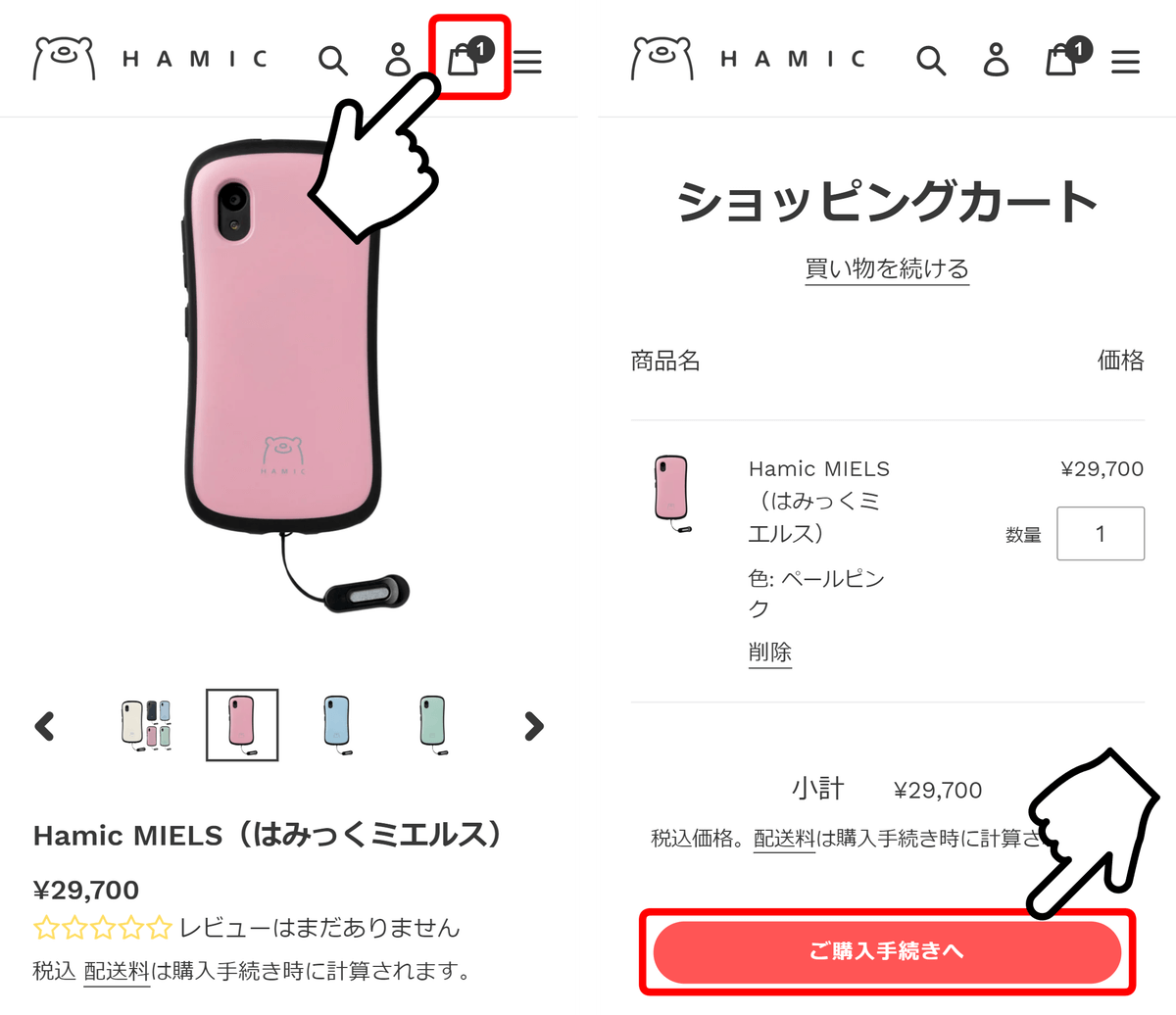 すべての購入したいアイテムをカートに追加できたら、画面上部にあるショッピングバッグのアイコンを選択して『ショッピングカート』を表示しましょう。アイテム一覧や選択した色に間違いがないかよく確認してくださいね。ショッピングカートの中身が確認できたら『ご購入手続きへ』へ進みます。