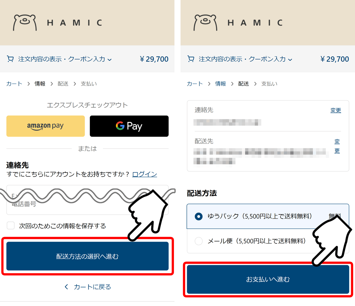 画面の指示に沿って連絡先と配送先を入力していきます。お子様の名前ではなく保護者の名前を入力しましょう。支払いに使用するクレジットカードの名義人と同じで大丈夫です。また、ここで連絡先を入力しなくても『amazon pay』『Google Pay』などとの連携(エクスプレスチェックアウト)によって配送先を連携できますよ。面倒な方はエクスプレスチェックアウトを活用してくださいね。すべて入力できたら『配送方法の選択へ進む』を選択します。続いて配送方法の設定です。ゆうパックかメール便が選べます。いずれもはみっくミエルスの購入なら送料無料です。好みの方にチェックを入れて『お支払いへ進む』を選択しましょう。なお、レンタル契約の方はゆうパックに固定です。