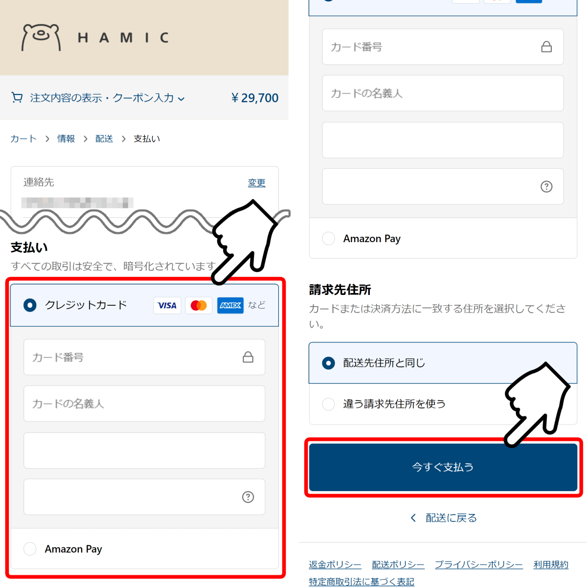 引き続き、支払い情報を登録します。デフォルトではクレジットカードがチェックされています。カード番号や名義人などの入力をしていきましょう。クレジットカードの他『Amazon Pay』での支払いも可能です。Amazon Payで支払う場合にはAmazonへのログインが必要です。お好みの支払い方法を選択・情報入力ができたら『今すぐ支払う』を選択してください。 - はみっくミエルスが届くのを待つ