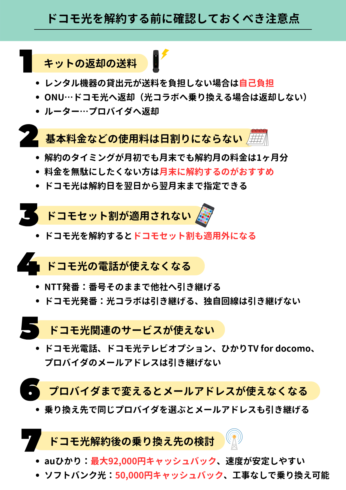 ドコモ光を解約する前に「今ドコモ光を解約しても問題ないのか?」を一度振り返っておきましょう。ドコモ光を解約する際には以下のような注意点があります。