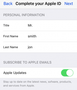 次に名前の入力を行う。ここはニックネームでも本名でも構わない。また、Apple Updateを有効にするとAppleから宣伝メールが届く。
