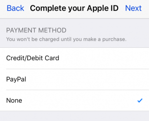 そうすると支払い方法選択の画面に移行する。クレジットカードはApple IDで設定する国と同じ国のクレジットカードでなければ使用できない。また、PayPalに登録されているクレジットカードもApple IDで設定する国のクレジットカーでないと登録ができないので、ここではNoneを選択する。