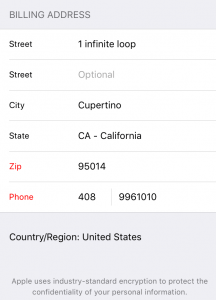 最後は住所の入力だ。もちろんここにはApple IDで設定した国の住所を入力しなければいけないが、日本在住の場合は入力できる海外の住所が無い。そこでApple IDで設定した国のApple本社の住所を入力する。