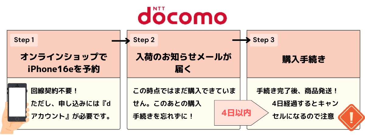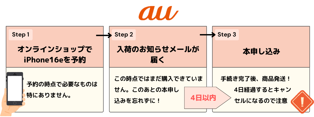 iPhone 16eの入荷確定メールを受け取ったら、本申し込み手続きを7日以内にしましょう。本申し込みでは本人確認書類や支払い方法の設定で銀行口座やクレジットカードが必要です。