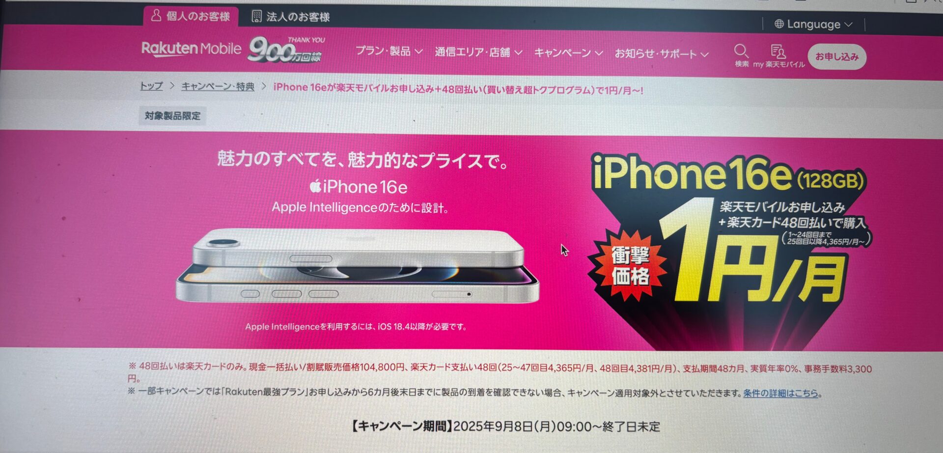 9月8日から始まった楽天モバイルではiPhone16eが月1円で購入できるキャンペーンを打ち出しました!