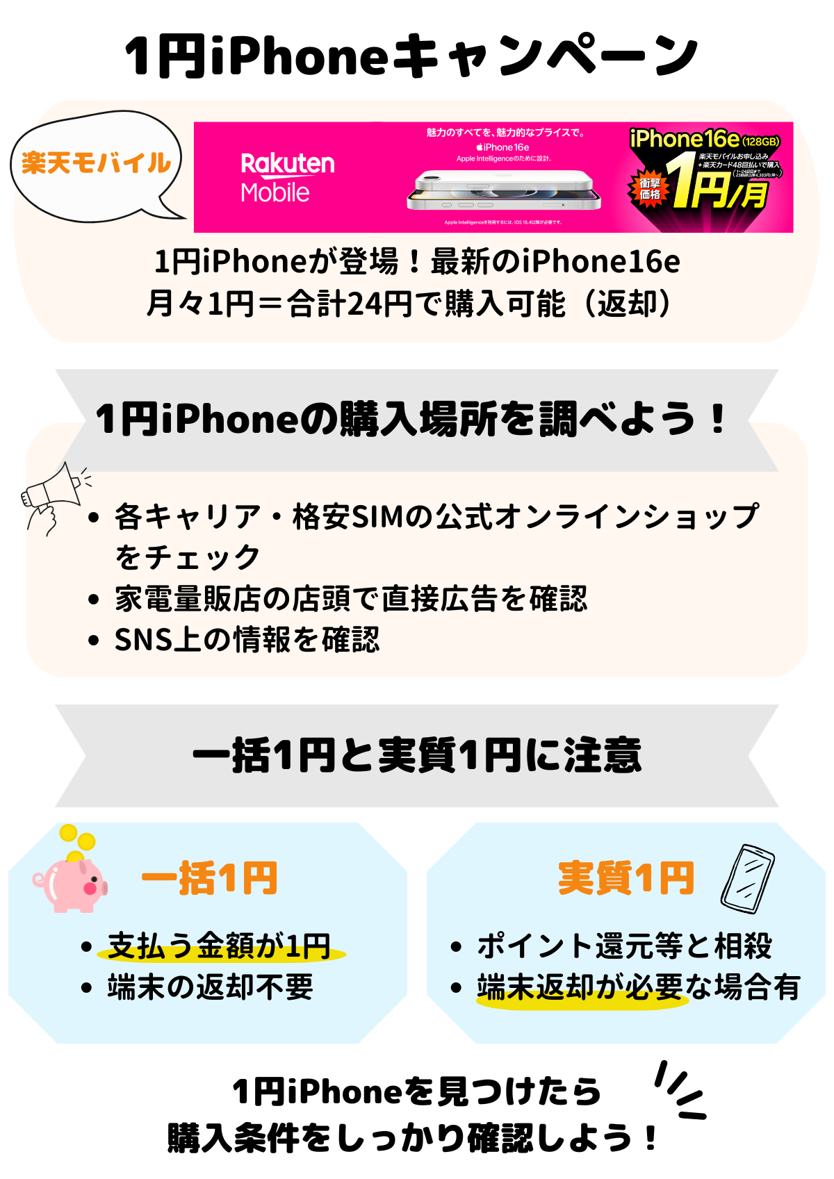 - 楽天モバイルとワイモバイルでは不定期で1円iPhoneの発売がある