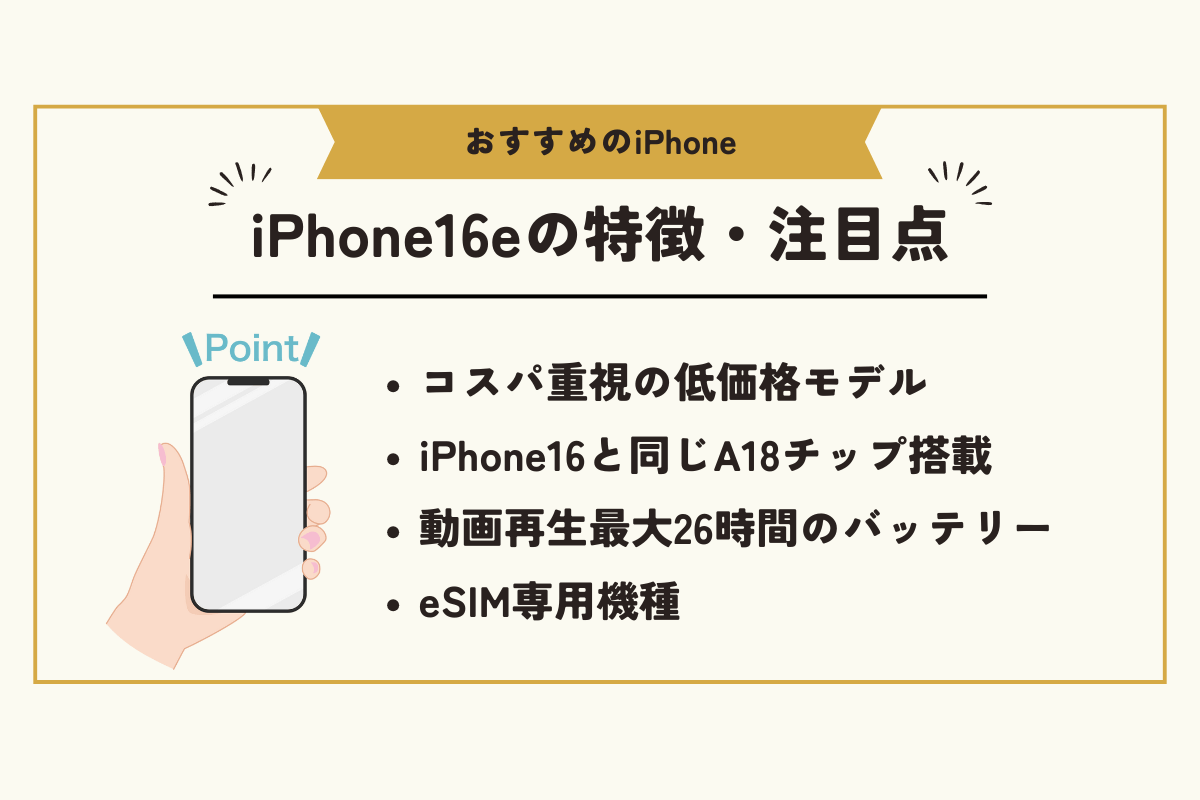 iPhoneのおすすめ人気機種2位は、iPhone16eです。実質的なiPhoneSEシリーズの後続といわれるiPhone16eはコスパ抜群な端末で、主な特徴は以下の通りです。