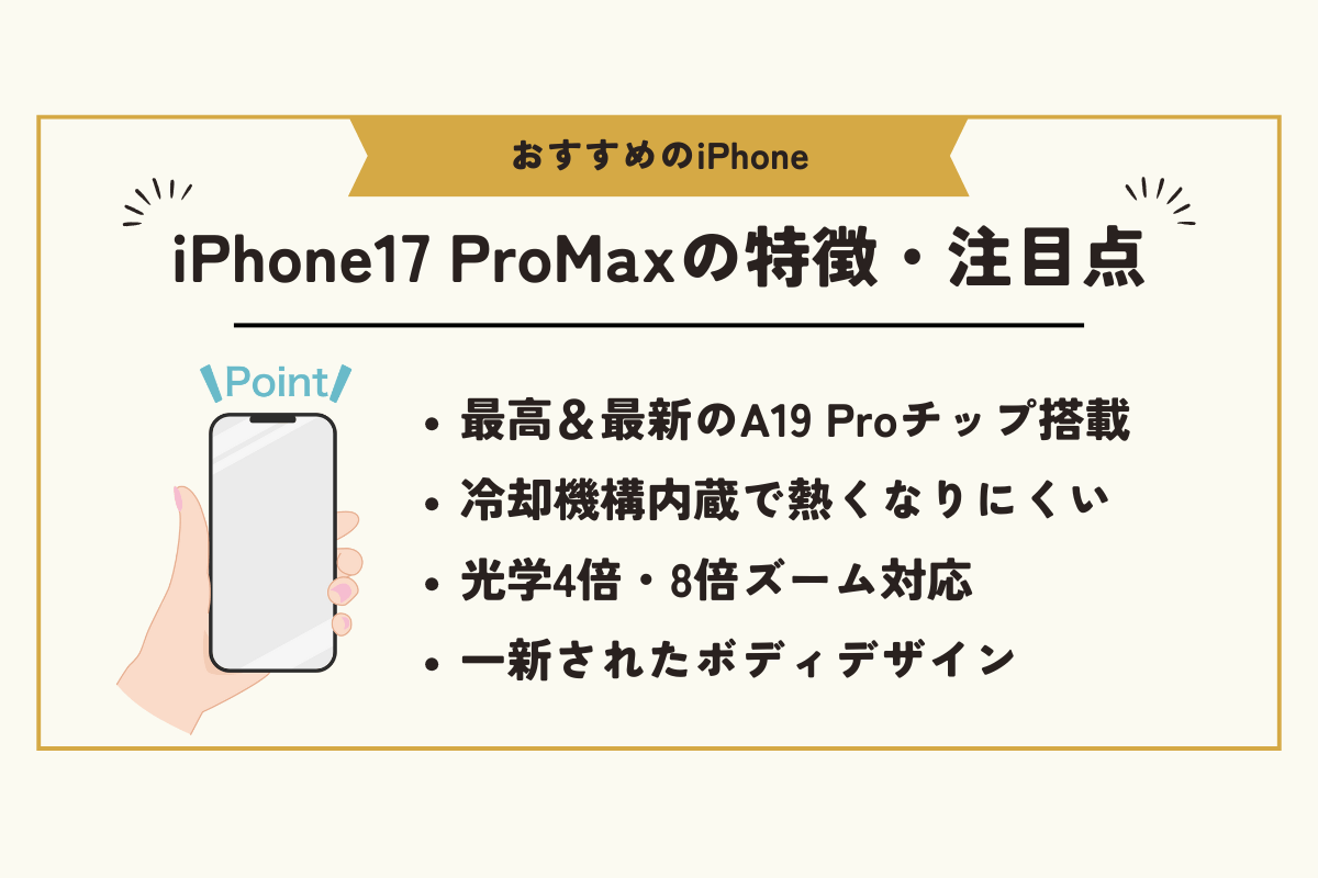また、価格面でもiPhone17 ProMaxより抑えられているので、できるだけ安価に最新最高スペックのiPhoneを使用したい方も満足できる機種といえるでしょう。