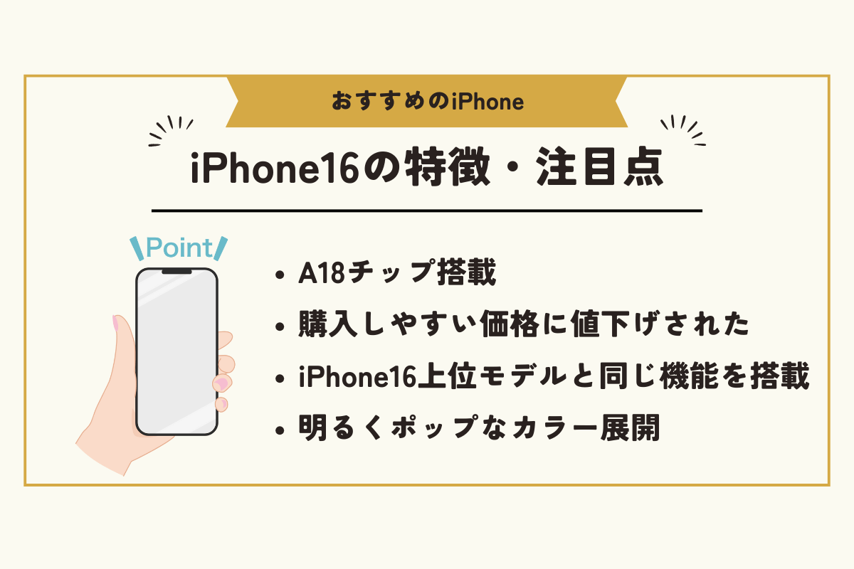 iPhoneのおすすめ人気機種4位は、iPhone16です。iPhone16は一世代前のiPhoneシリーズのスタンダードモデルです。主な特徴がこちらです。