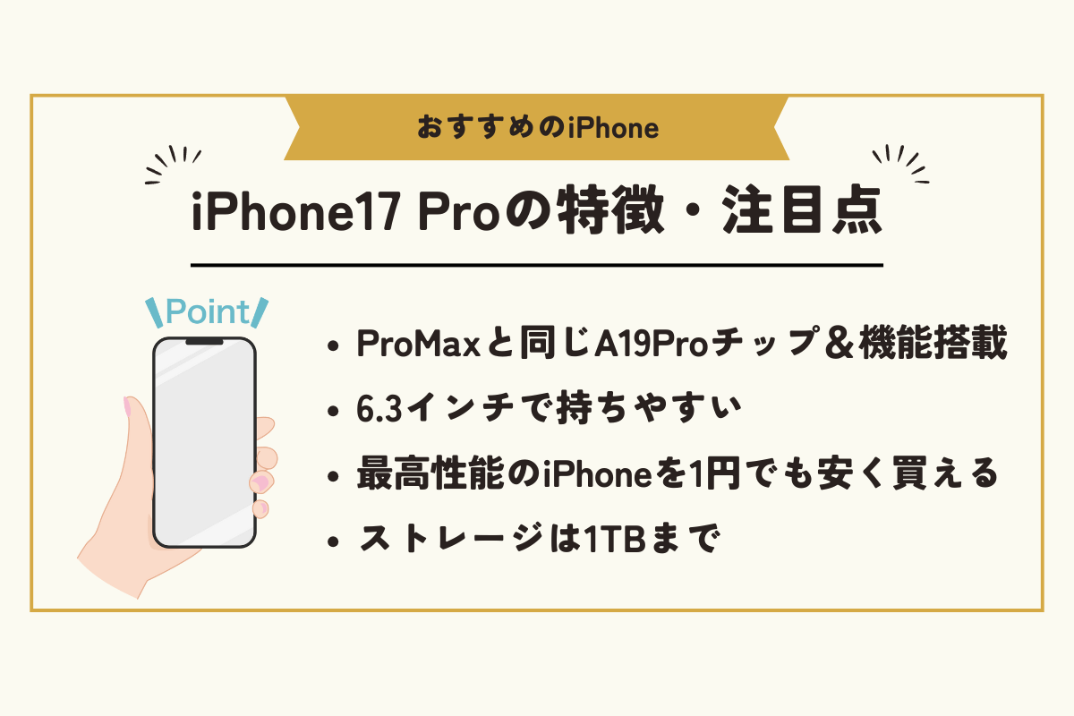 iPhoneのおすすめ人気機種5位の、iPhone17 ProはハイグレードなiPhoneをコンパクトに持ち歩ける最新機種です。主な特徴がこちらです。
