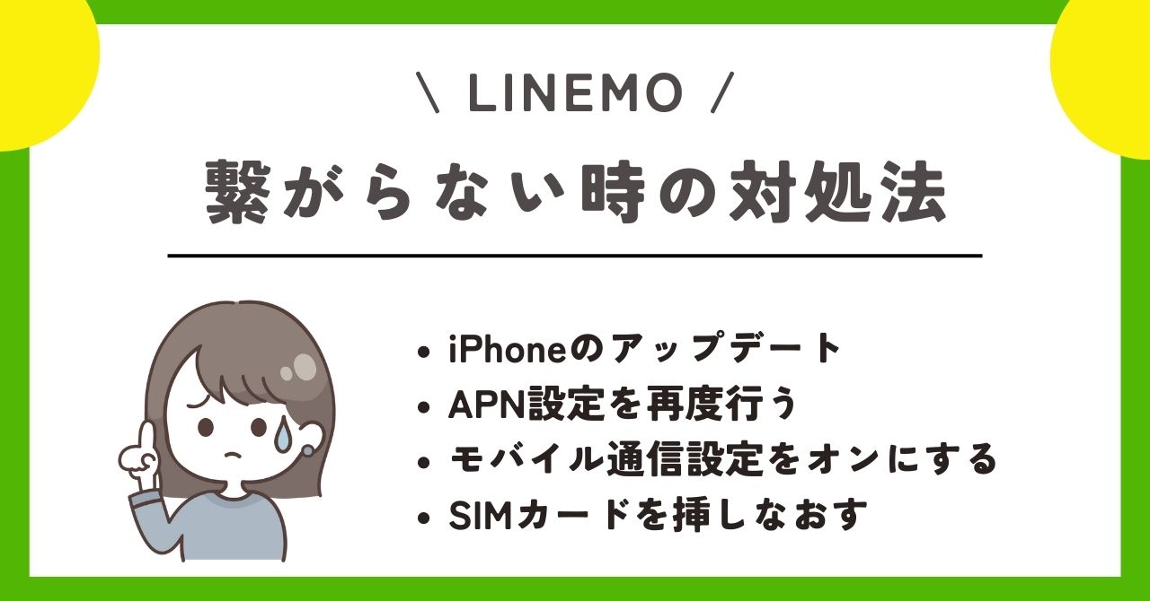 - LINEMOが繋がらない原因に当てはまるものがないかチェック