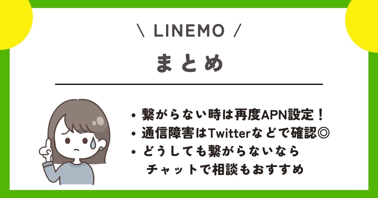 LINEMOが繋がらない時の原因や対処法について解説してきましたが、いかがでしたか?今回のまとめは以下の通り。