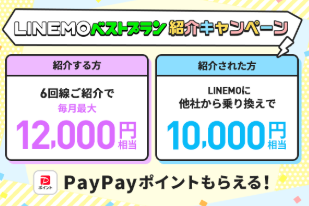 | LINEMOベストプランV:12,000円相当 LINEMOベストプラン:10,000円相当 | 他社からの乗り換えでPayPayポイントがもらえる 新規契約になると受け取りポイントが減るので注意 |