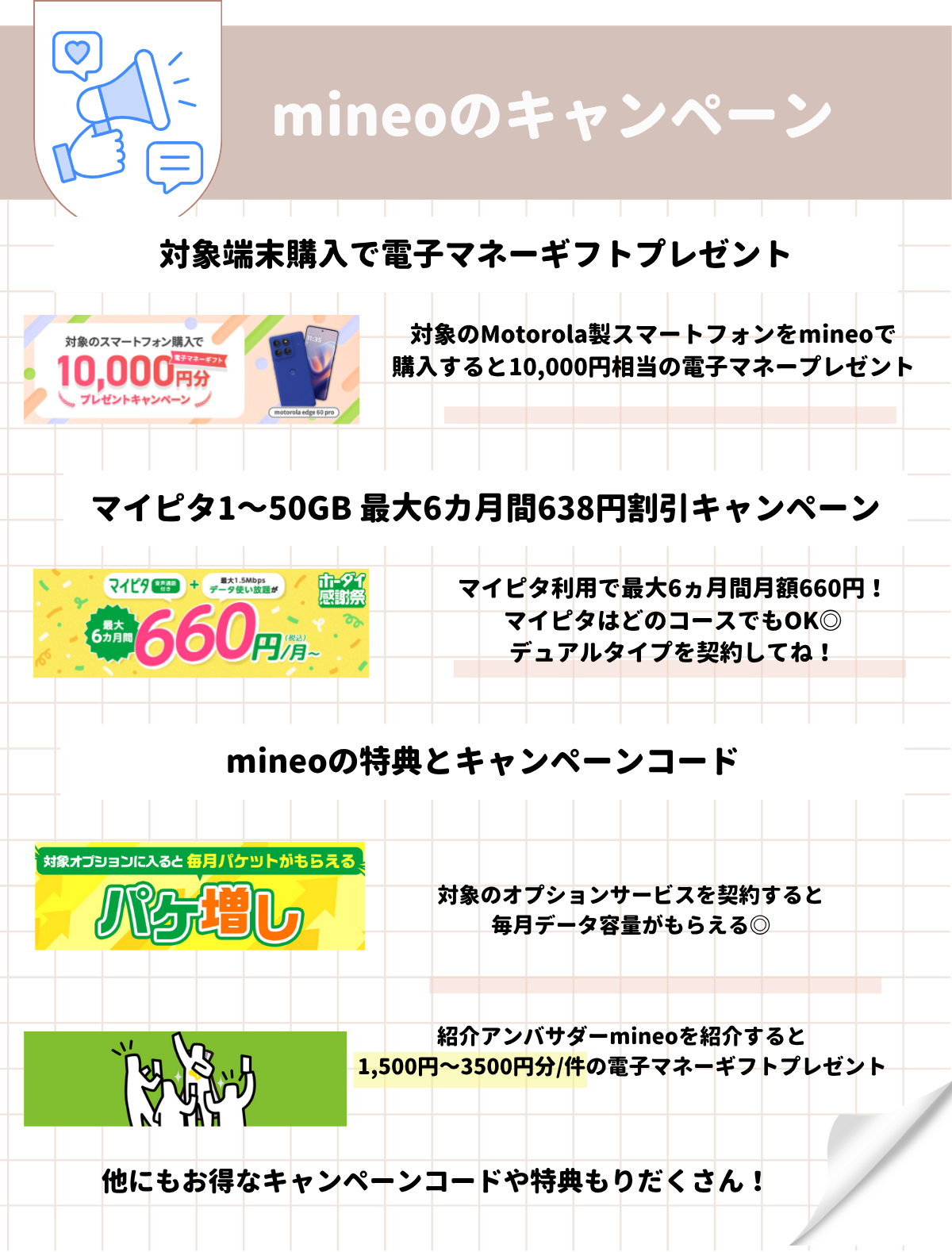 mineoでは、利用料金が安いだけではなく、お得なキャンペーンが開催されています。mineoは、他の携帯会社にない独自のサービスや特典が充実しており、ユーザーにメリットが大きい格安SIMです。