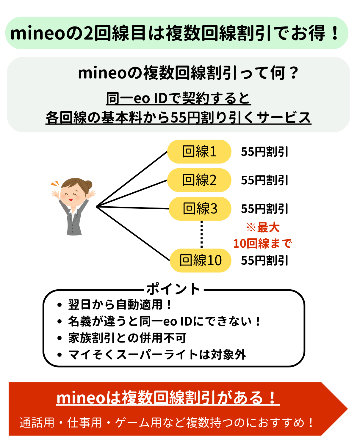 mineoでは、2回線目を同一のeoIDで契約すると1回線毎に月額基本料金から55円割引される「複数回線割引」が適用されることが分かりましたね!