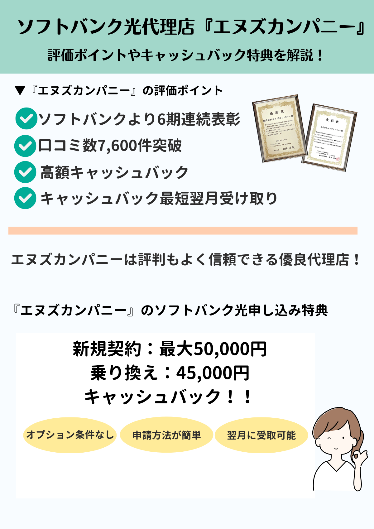 ソフトバンク光の代理店『エヌズカンパニー』は、キャッシュバックの申請・受け取りがスムースでオプション加入もなく評判の高い代理店です。