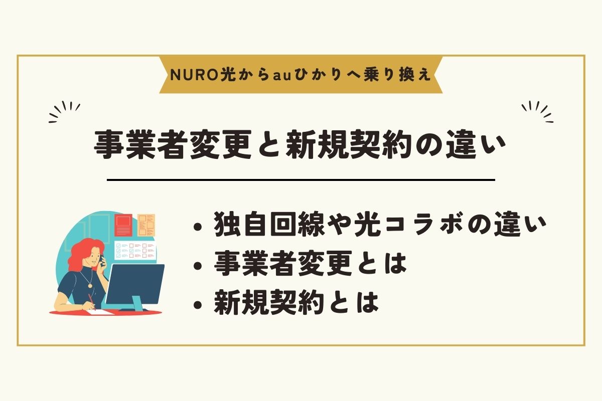 NURO光からauひかりへの乗り換えは、事業者変更ではなく「新規契約」となります。事業者変更での乗り換えはできないので、事業者変更での切替日もありません。