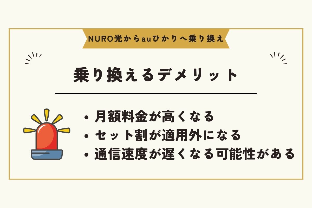 ここでは、NURO光からauひかりへ乗り換えるデメリットについてご紹介します。乗り換えてから後悔することがないよう事前に確認しておきましょう。