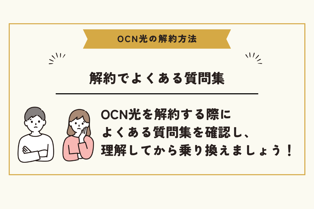 OCN光を解約するうえでよくある質問に答えます。こちらで解約時の不明点を解決し、スムーズに解約してしまいましょう。こちらで解決していくQ&A一覧はこちらのとおりです。