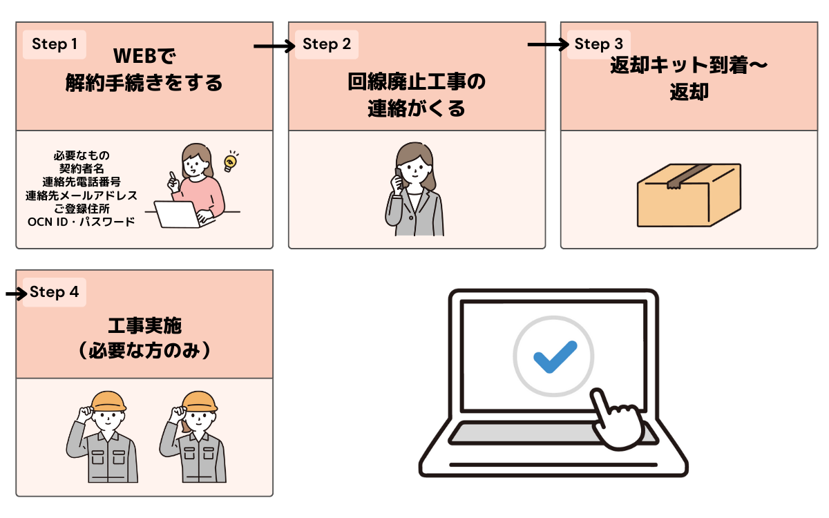 ここからはOCN光の具体的な解約手順と全体の流れを説明していきます。解約に必要な手順は以下の5ステップです。ちなみに、OCN光の解約窓口はWEBのみとなっています。