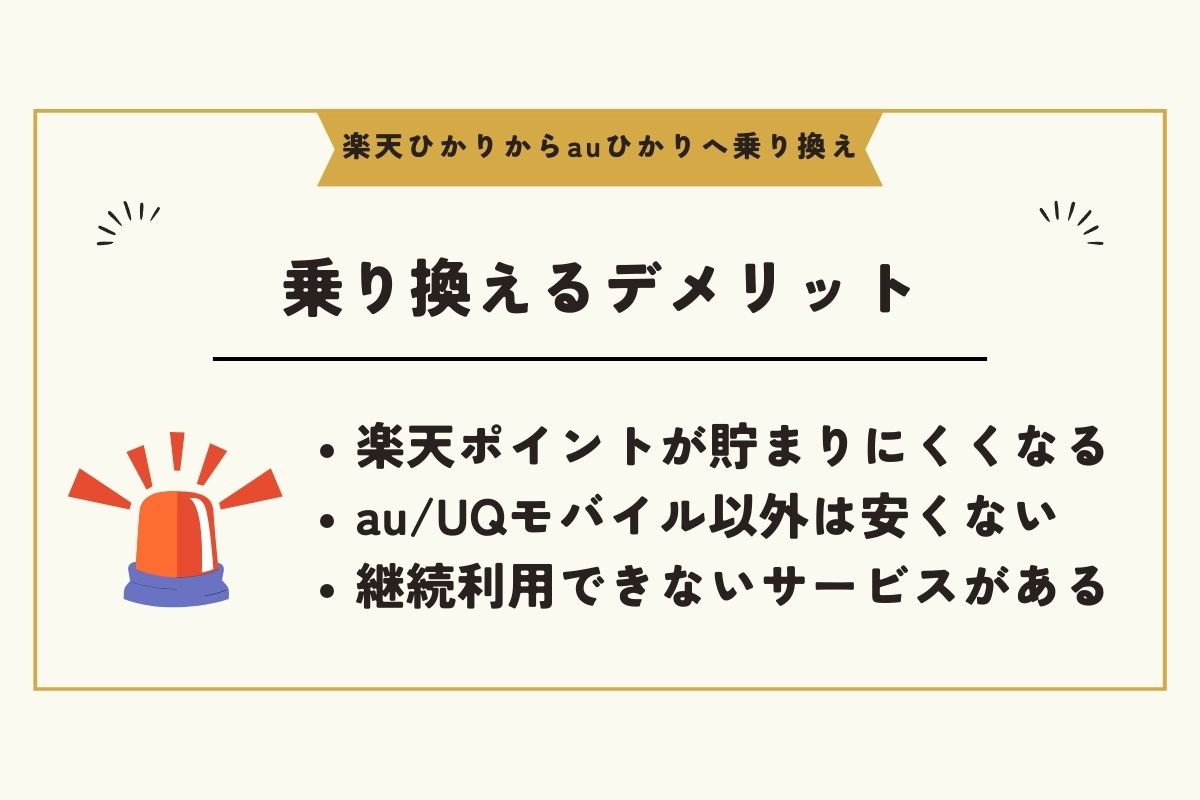 ただし、先述の通り楽天ひかりからauひかりへの乗り換えは高額キャッシュバックが望めるため、このようなデメリットを上回るメリットがあるともいえます。