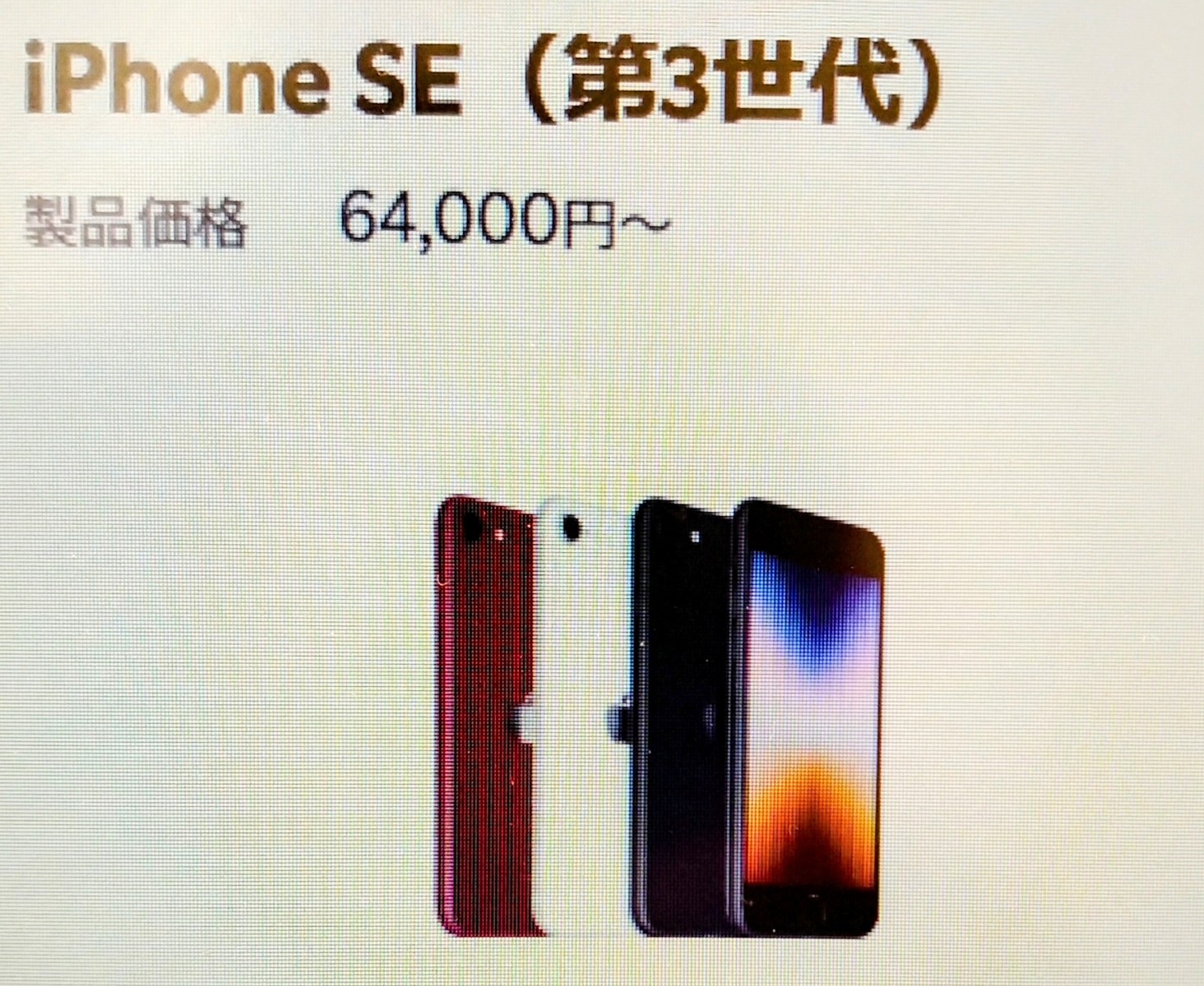 - iPhone SE(第3世代)|64,000円~(実質31,992円~)