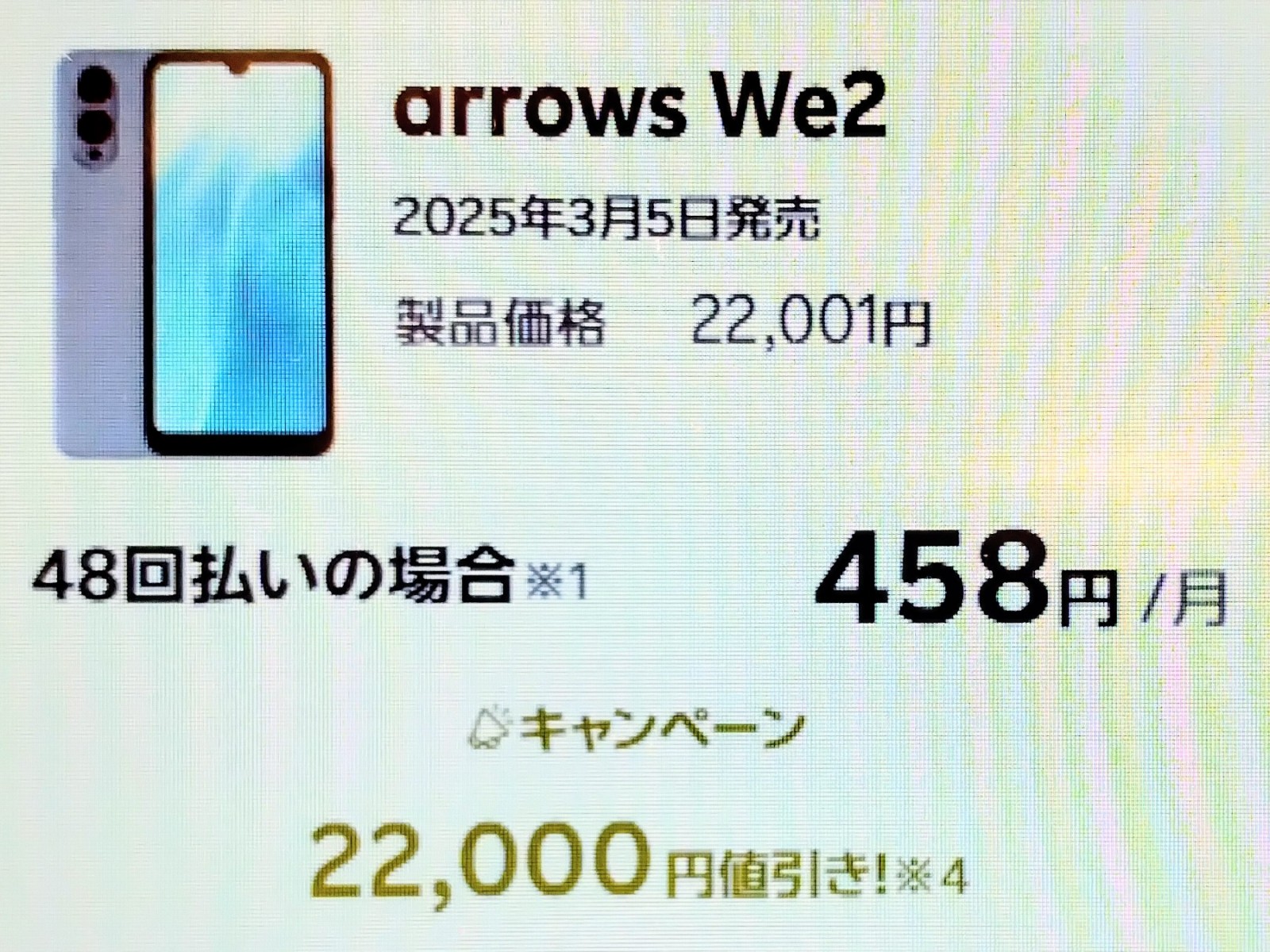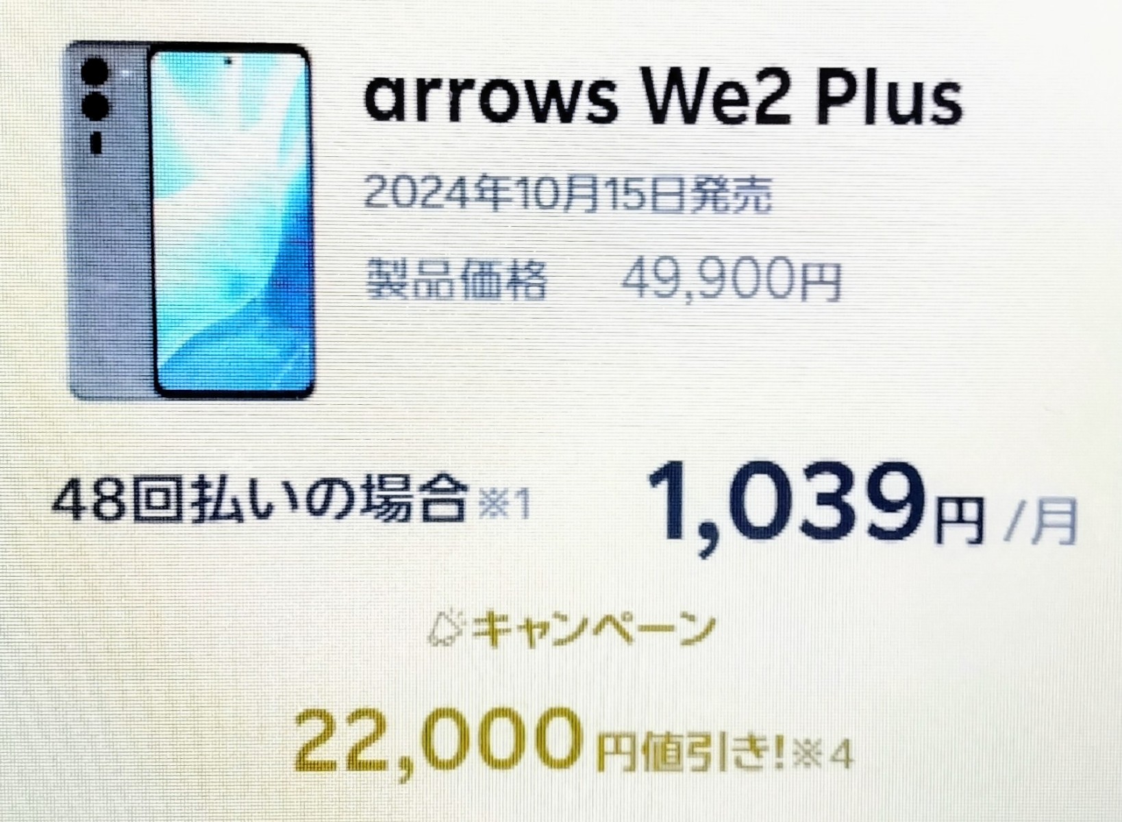 | arrows We2 Plus | 製品価格:49,900円 楽天モバイル申し込み+NMP:-22,000円 値引き後価格:27,900円 |