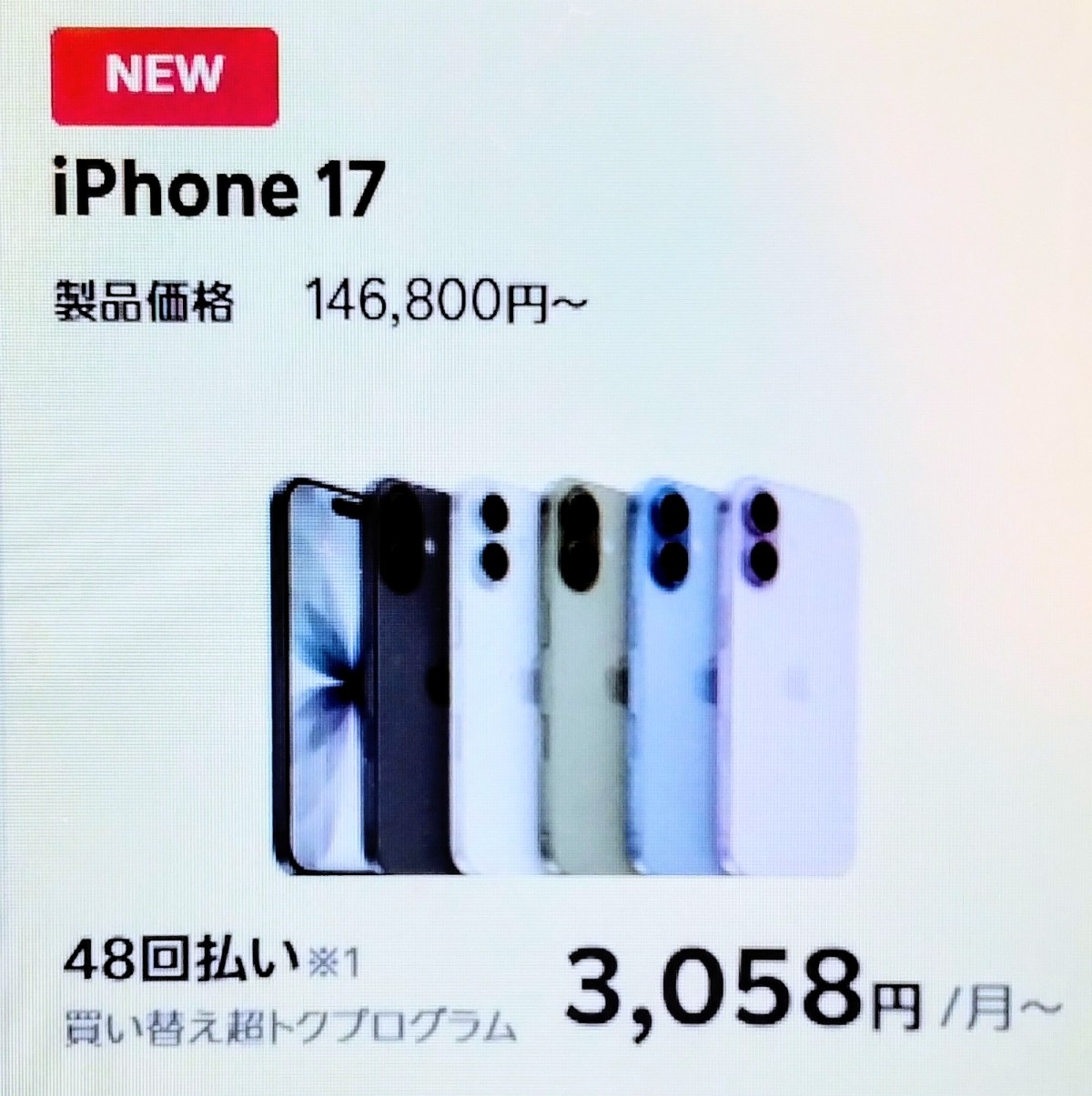 - iPhone17シリーズ|146,800円~(実質73,392円~)