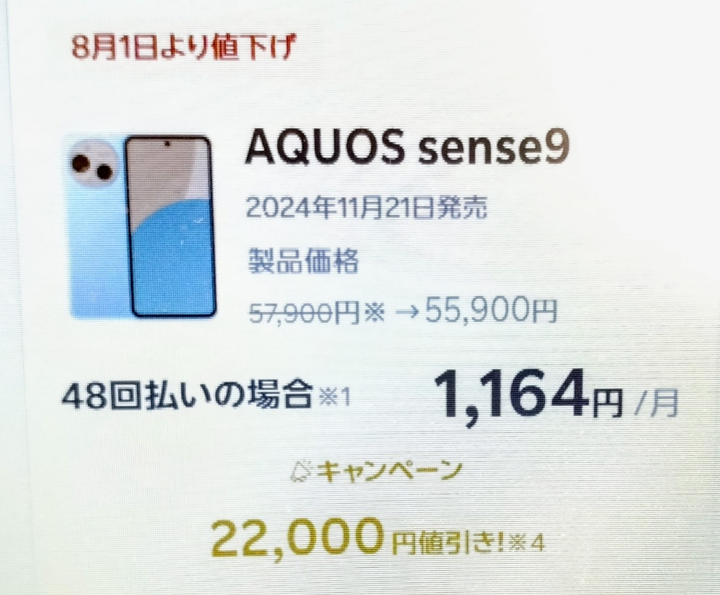 | AQUOS sense9 | 製品価格:55,900円 楽天モバイル申し込み+NMP:-22,000円 値引き後価格:33,900円 |
