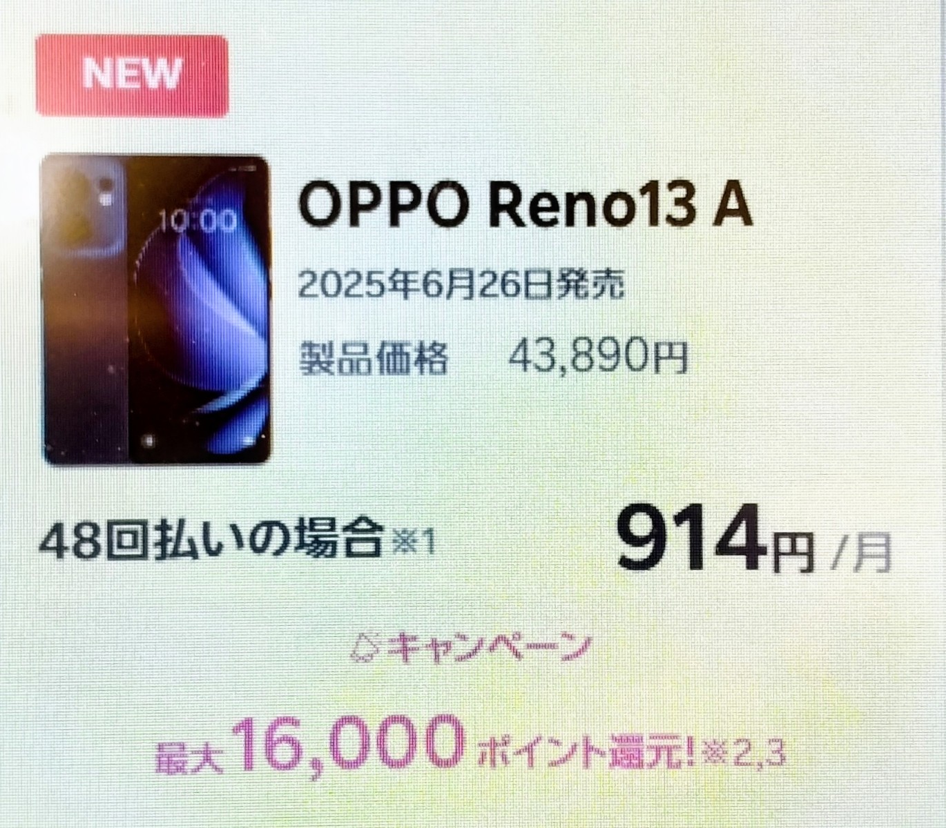 | 楽天モバイル申し込み+他社から電話番号そのまま乗り換え+OPPO A3 5Gまたはarrows We2購入で1円! | |