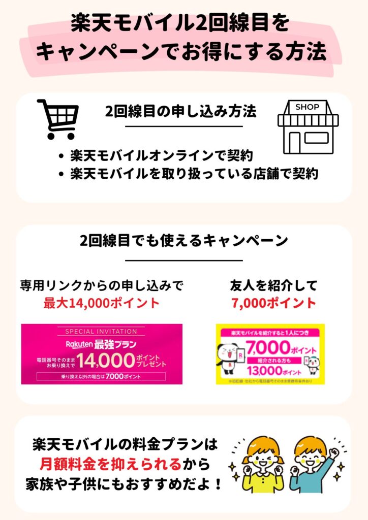この記事では、楽天モバイルで2回線目を申し込む手順やキャンペーンを利用して家族みんなでお得に契約する方法について解説します。
