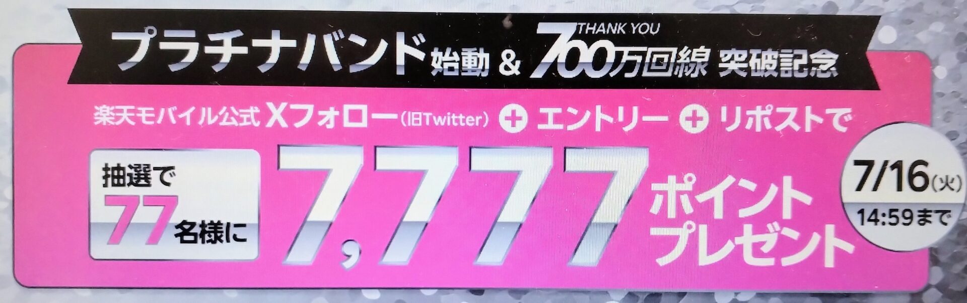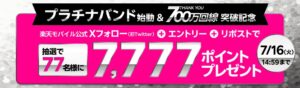 楽天モバイルでは、プラチナバンドの提供開始&契約数700万回線突破を記念して、楽天モバイル公式X(旧Twitter)をフォロー&リポストで抽選で77名様に7,777ポイントプレゼントキャンペーンを実施しています!