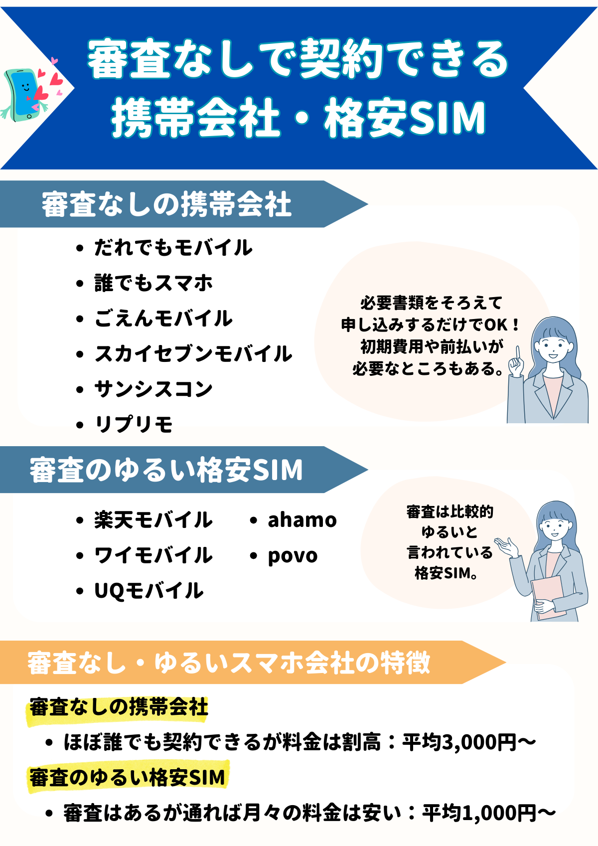 審査のないスマホや審査のゆるい格安SIMを利用してスマホの契約ができるといいですね。気になる携帯電話会社・格安SIMがあれば申し込みしましょう。
