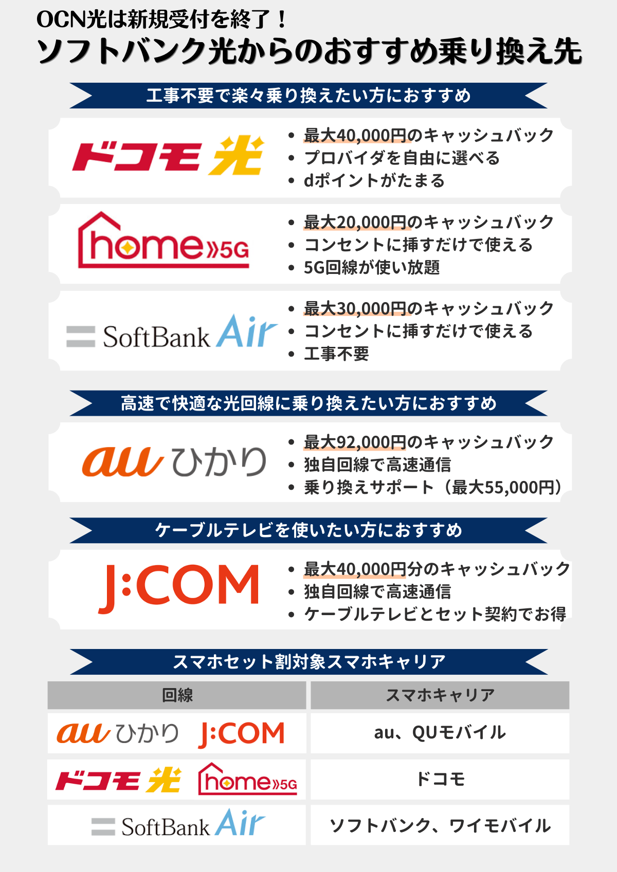 OCN光は2023年6月30日をもって新規受付を終了しました。そのため、これからソフトバンク光から乗り換えるなら、OCN光以外の光回線に乗り換えましょう。
