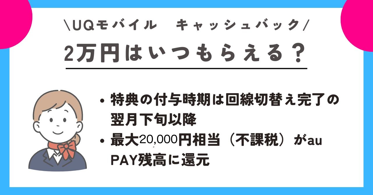 UQモバイルでは最大20,000円相当(不課税)がau PAY残高に還元されるスペシャルクーポンやキャンペーンを実施しています。特典の付与時期は回線切替え完了の翌月下旬以降です。(「au PAYご利用特典」のみau PAY(コード支払い/請求書払い)利用期間の翌々月下旬以降)