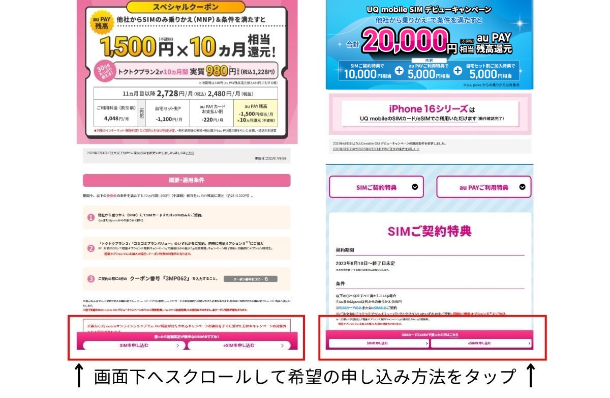 いずれもUQモバイルオンラインショップから申し込みましょう。各キャンペーンの適用条件や注意点は以下で詳しく解説しているのでチェックしてみてください。