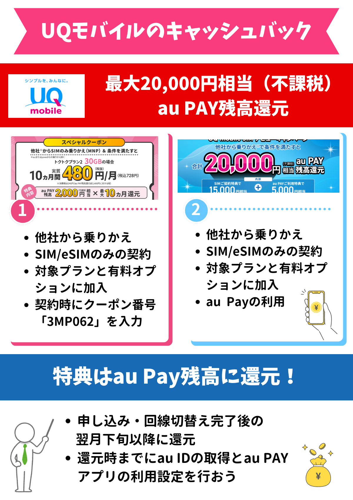 UQモバイルでは2万円がもらえる現金キャッシュバックキャンペーンは実施されていませんが、最大20,000円相当(不課税)がau Pay残高に還元されるキャンペーンを実施しています。