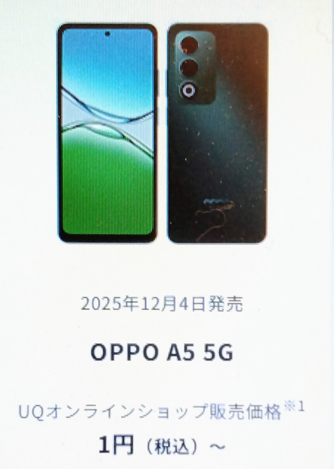 UQモバイルではOPPO A5 5Gを一括1円で購入できます。適用条件はこちらです。