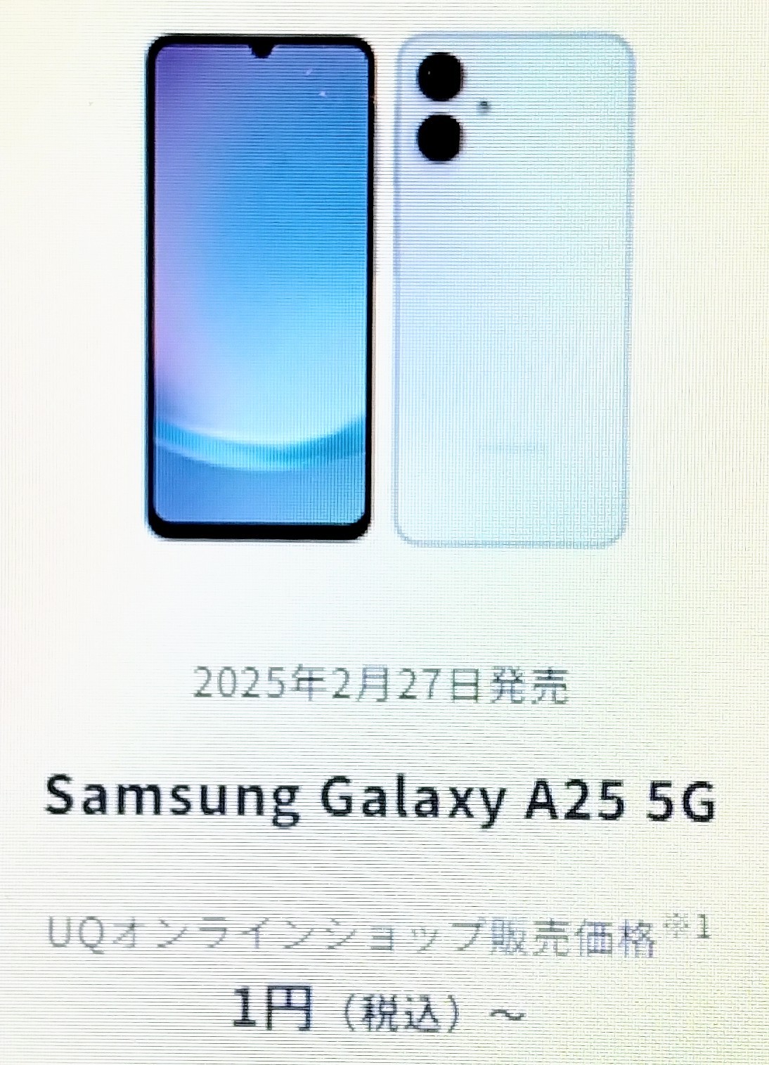UQモバイルではSamsung Galaxy A25 5Gを一括1円で購入できます。適用条件はこちらです。