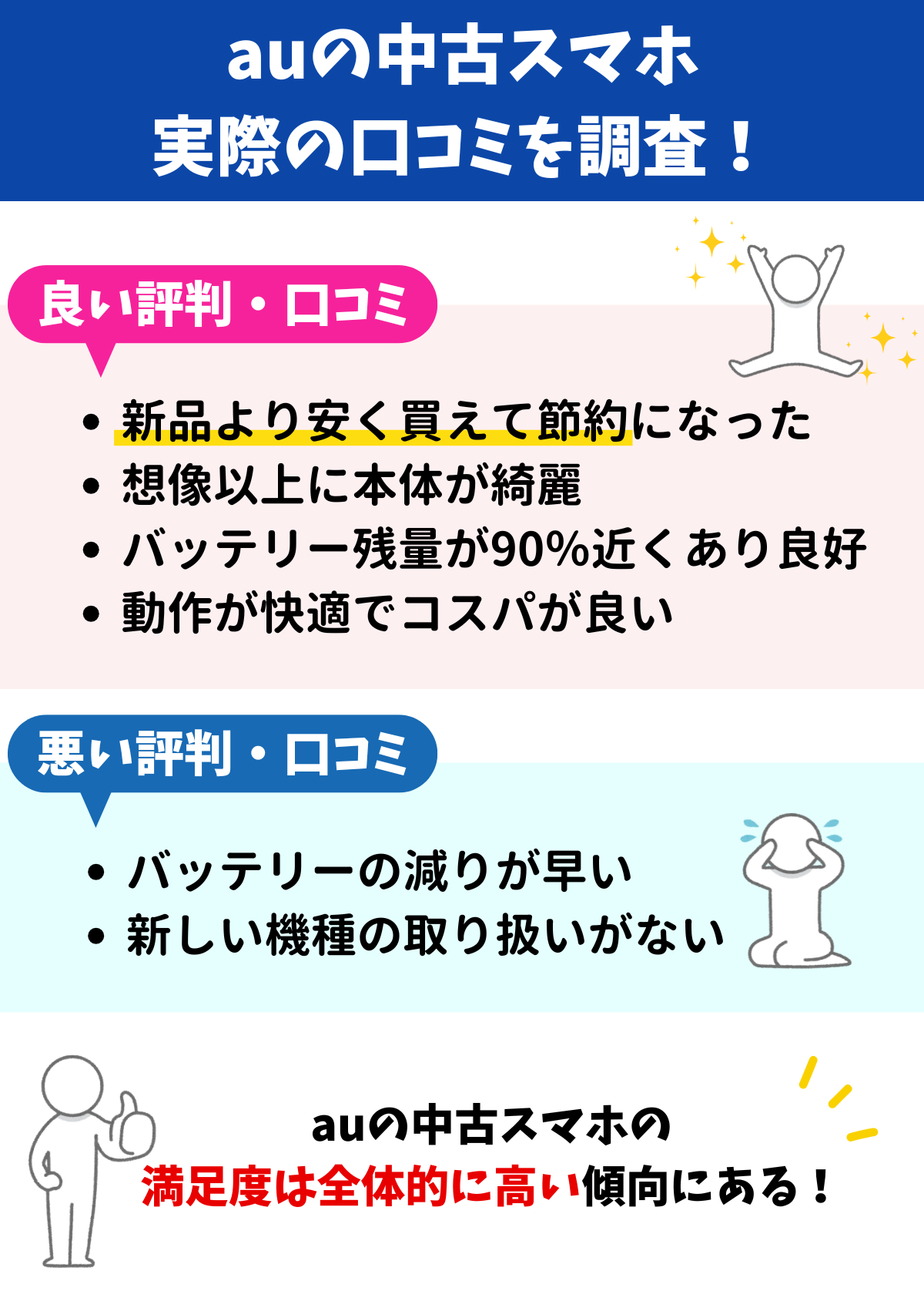auの中古スマホは新品よりも安く買えて助かった・節約になったとの声が多数寄せられました。