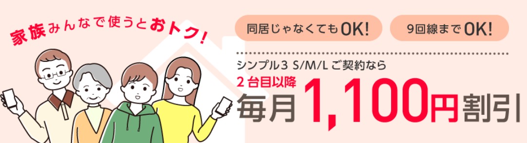 副回線で2回線目契約することの一番のメリットは家族割を適用できることです。家族割引により、副回線はシンプル3なら月々1,100円(税込)割引で利用可能です。