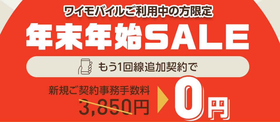 ワイモバイルでは、現在ワイモバイルユーザーの方が対象機種にもう1回線追加契約で通常3,850円(税込)の事務手数料が無料になる年末年始セールを実施中です。