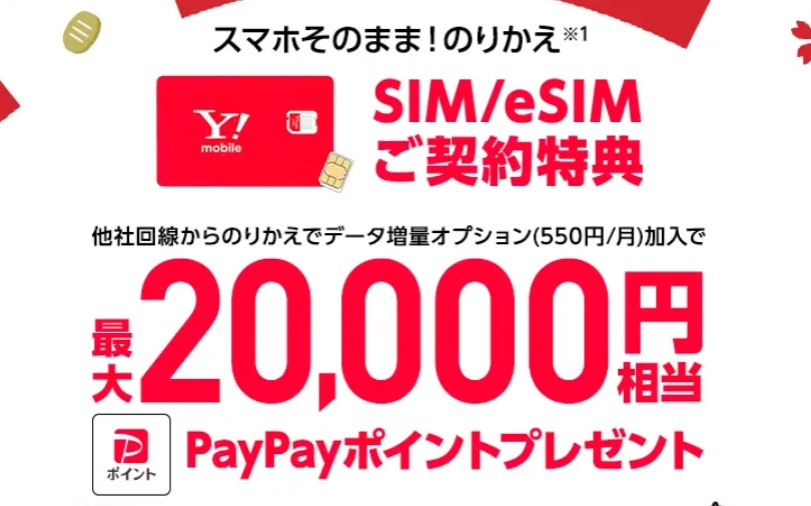 ワイモバイルでは、SIM/eSIMのみ契約で条件を満たすと最大20,000円相当のPayPayポイントがもらえる「SIM/eSIM契約特典」を実施しています。