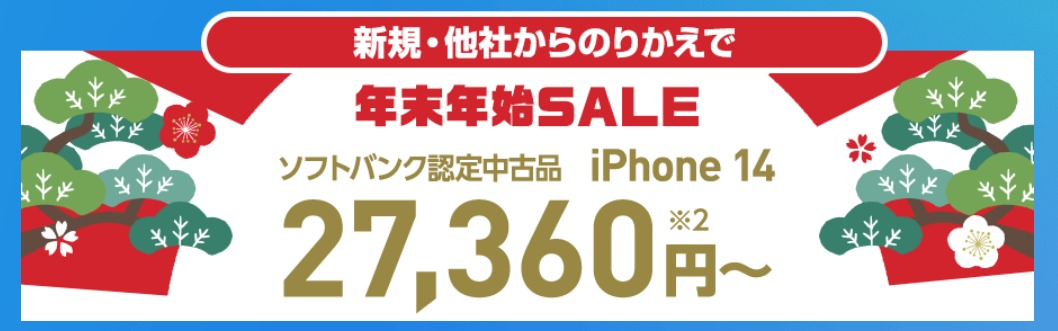 ワイモバイルでは、ソフトバンク認定中古品iPhoneを大幅値引きで購入できるキャンペーンを実施しています。現在は年末年始セールとして、ソフトバンク認定中古品のiPhone 14(128GB)とiPhone 13(128GB)がさらに通常よりもお得に購入ができますよ。