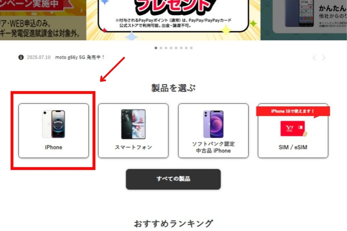 まずはワイモバイルの公式サイトにアクセスして、iPhoneを選択しましょう。