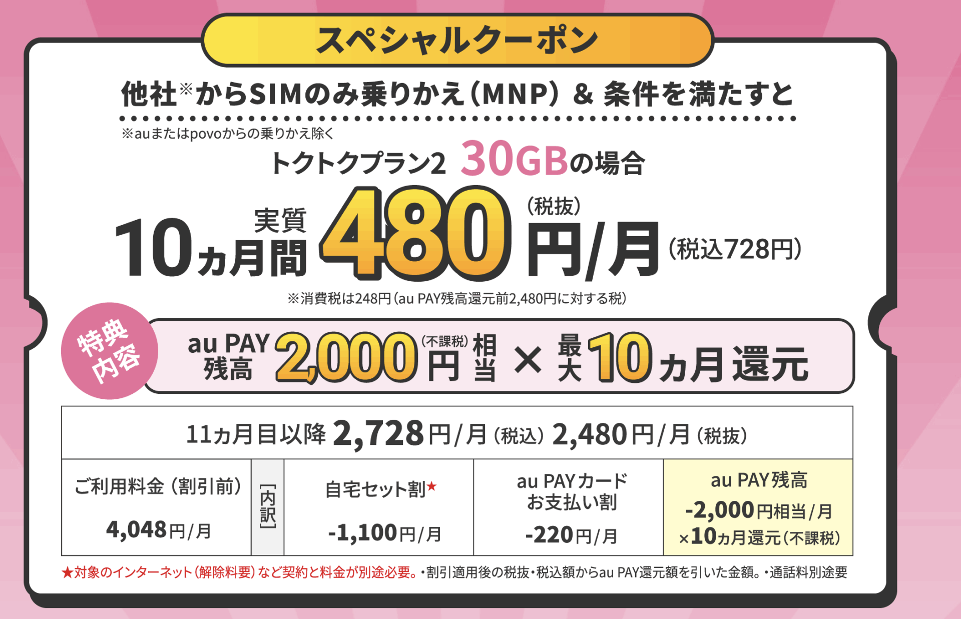 クーポンを活用するとトクトクプラン2 30GBが実質728円(税込)で10ヶ月利用できるので年間のスマホ料金を大きく抑えてくれますよ。