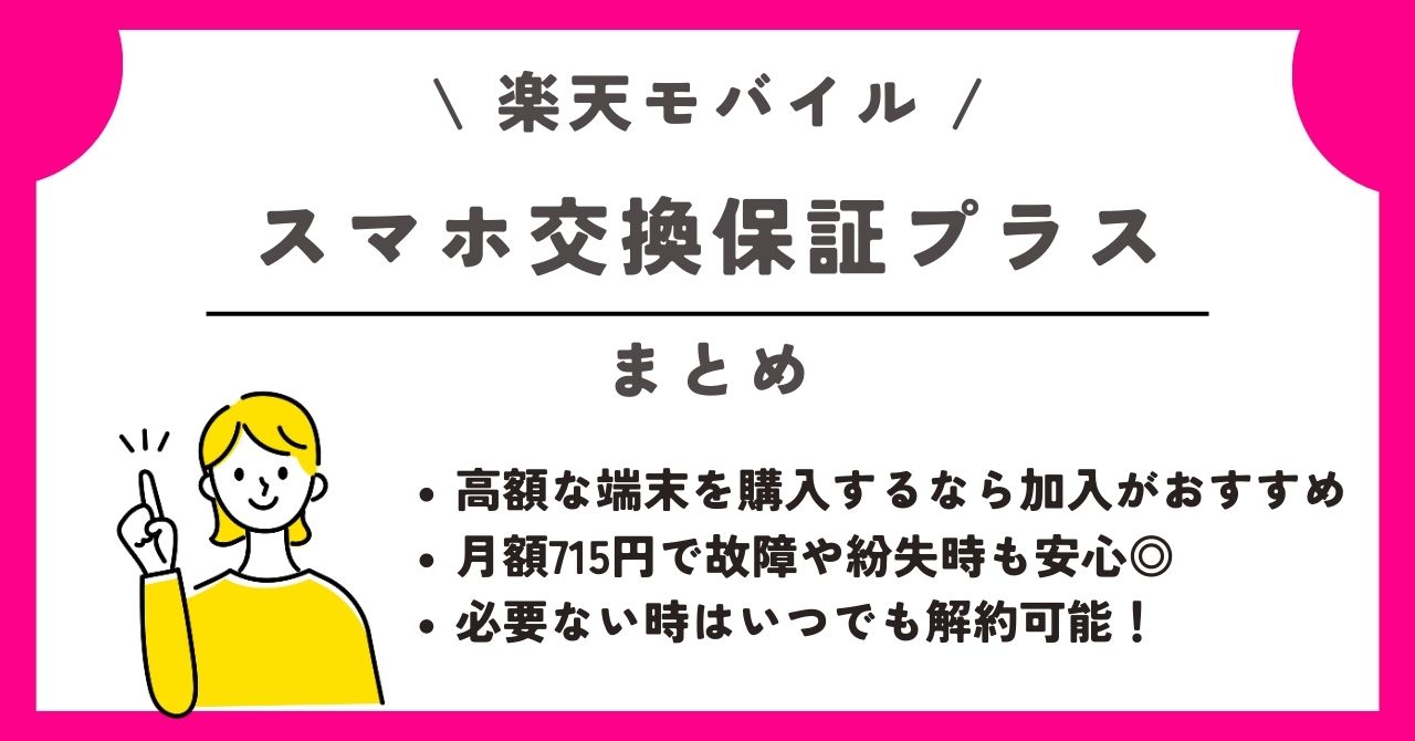 楽天モバイルのスマホ交換保証プラスについて解説してきましたが、いかがでしたでしょうか。楽天モバイルのスマホ交換保証プラスは、月額715円で故障や紛失などのトラブルがあったときに、低価格で新品同等のスマホに交換することができる保証サービス。