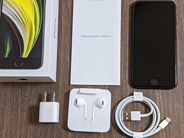 iPhone SE2のカラーバリエーションはホワイト、ブラック、レッドの3色です。EarPods、ライトニングUSBケーブル、USBの電源アダプタが同梱されています。